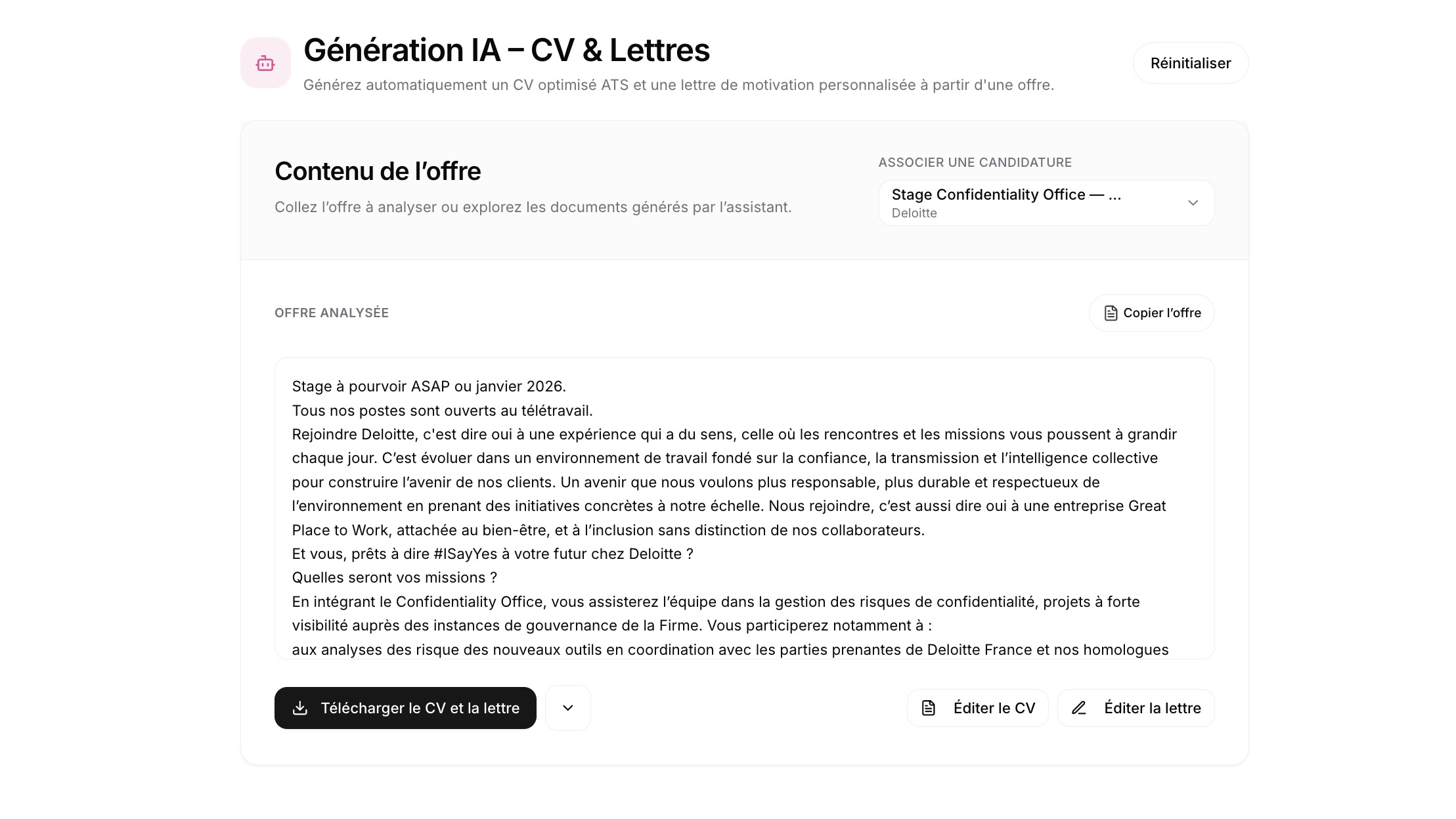 Colle le contenu de l'offre. L’outil extrait les infos et te propose un CV et une lettre adaptés ainsi que la fonctionnalité de l'enregistrer dans ton suivi de candidatures. Tu ajustes, tu exportes.