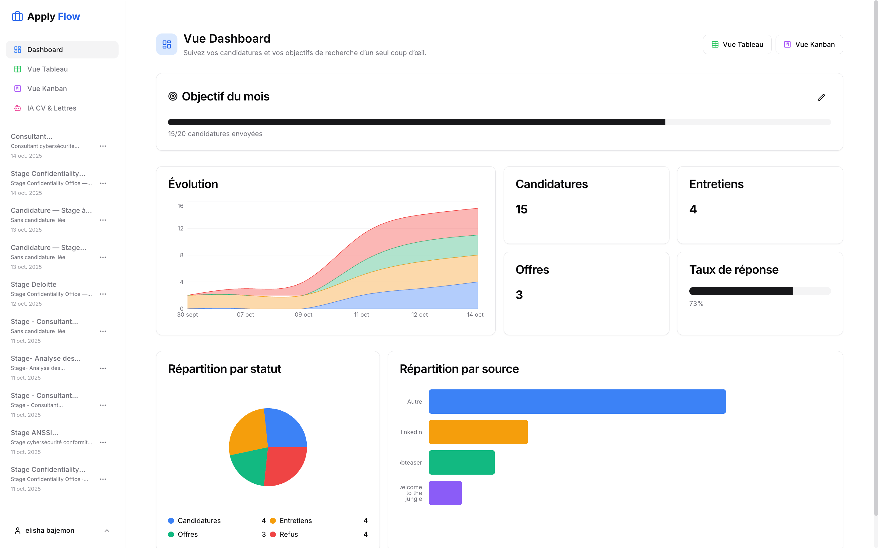 Visualise la répartition de tes candidatures, tes taux de réponse et les actions prioritaires directement sur ton tableau de bord.