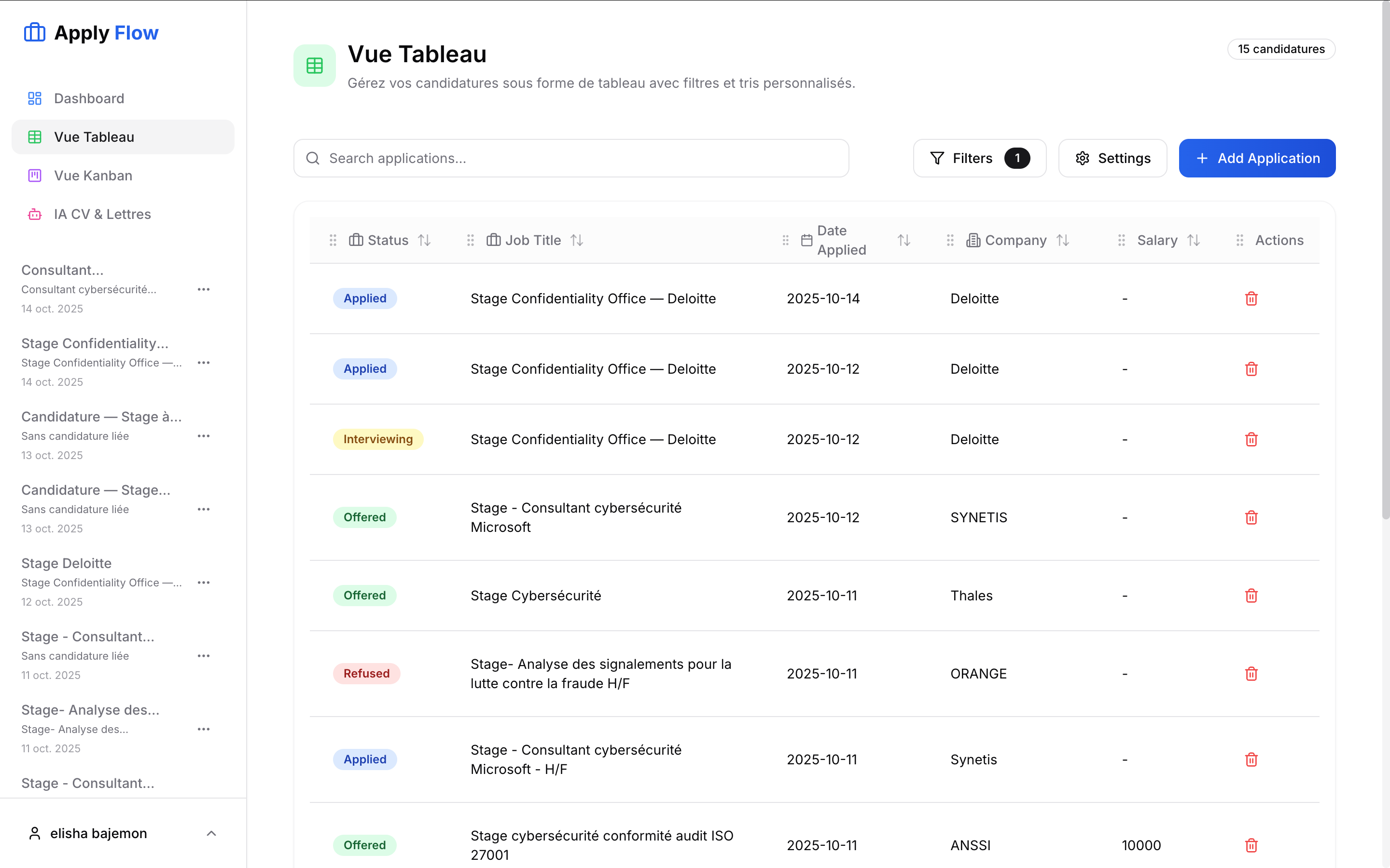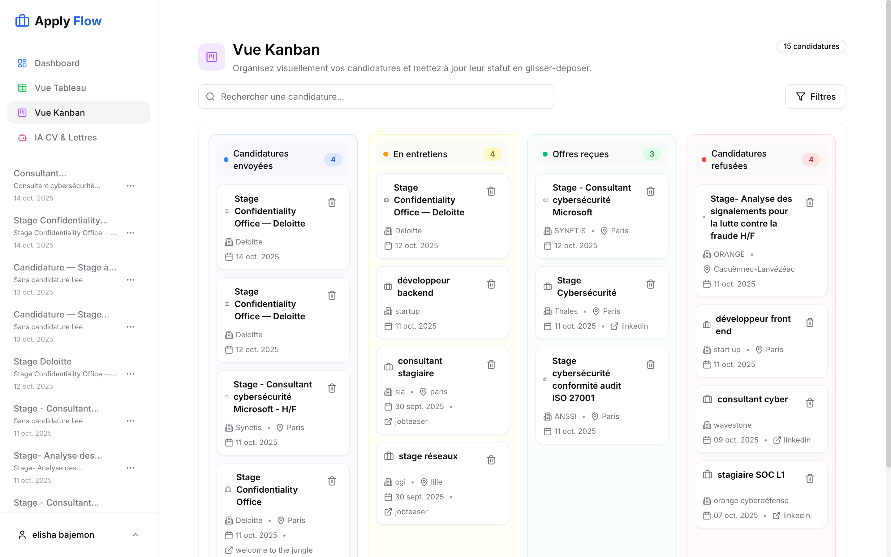 Déplace tes candidatures par statut. Vue claire, priorités évidentes, zéro distraction.